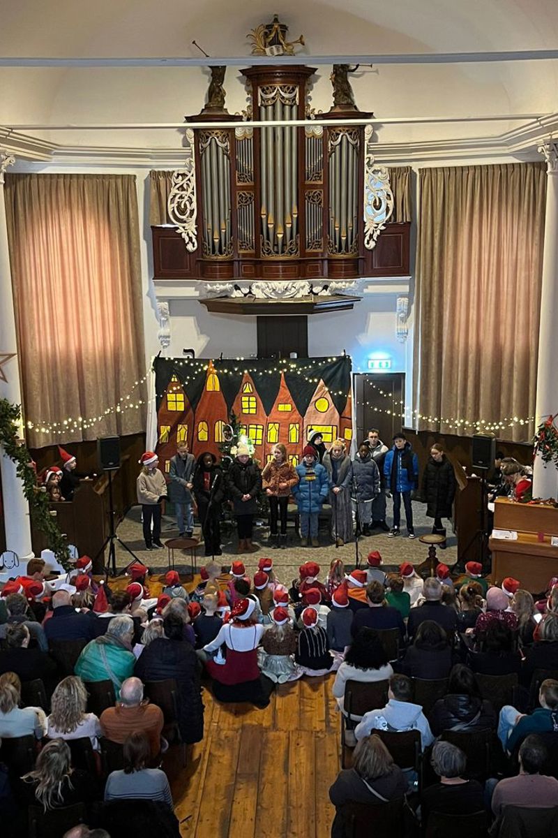Op vrijdag 20 december was het tijd voor de kerstmusical in de Doopsgezinde kerk. De acteurs uit groep 7/8 gaven een fantastische voorstelling, maar gelukkig zongen alle kinderen enthousiast mee met de kerstliedjes. Bij de ingang werden we welkom geheten met sfeervolle kerstmuziek, wat de magische sfeer van het evenement compleet maakte.